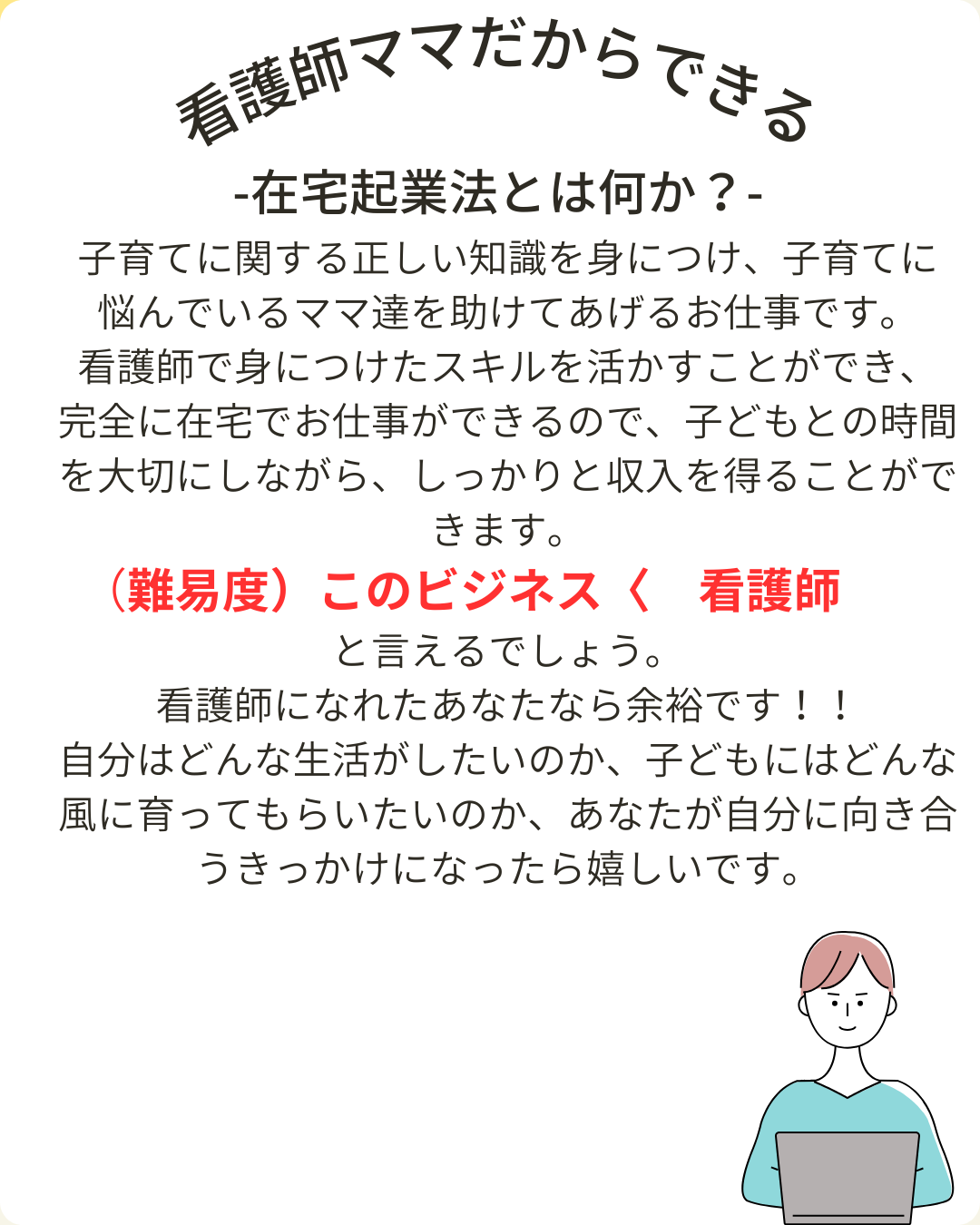 子どもの成長を一緒に楽しみながら、在宅で今よりも収入を増やしママが笑顔で輝いていくためのヒントをたくさん掴み取ることができるはずでしょう!